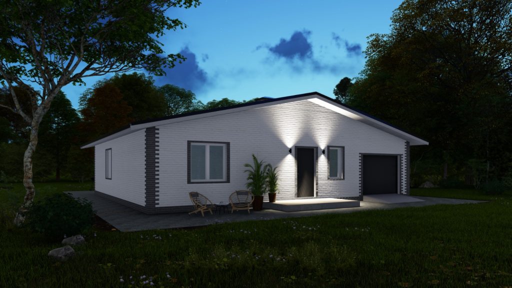 Одноэтажный дом с тремя спальнями, просторной кухней-гостиной с витражными окнами и выходом во внутренний двор. В общую застройку одноэтажного дома входит гараж на два автомобиля.