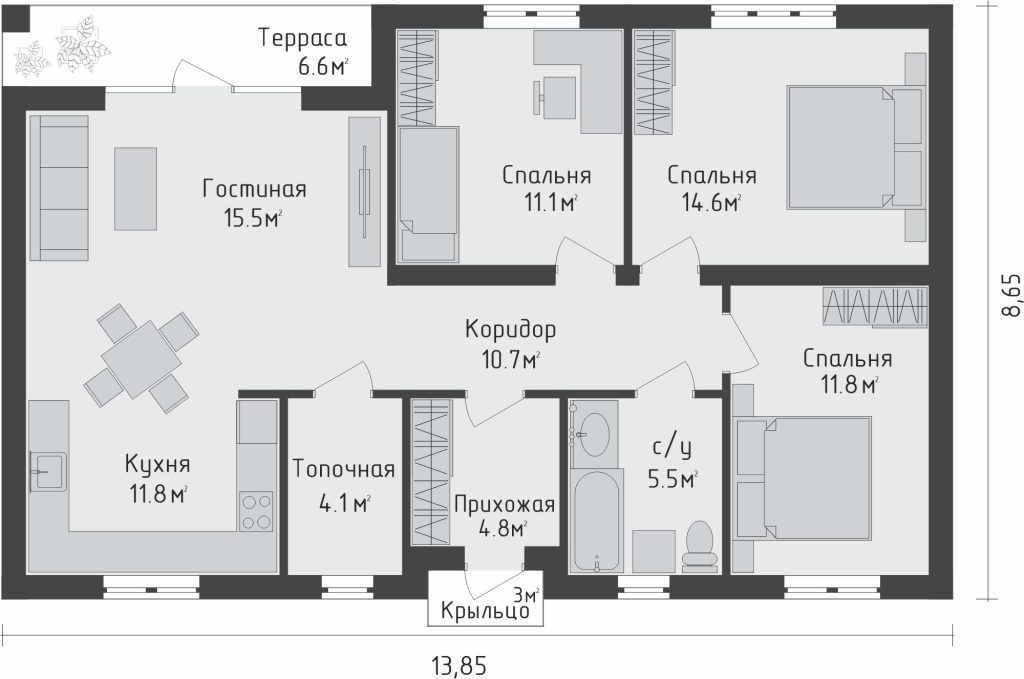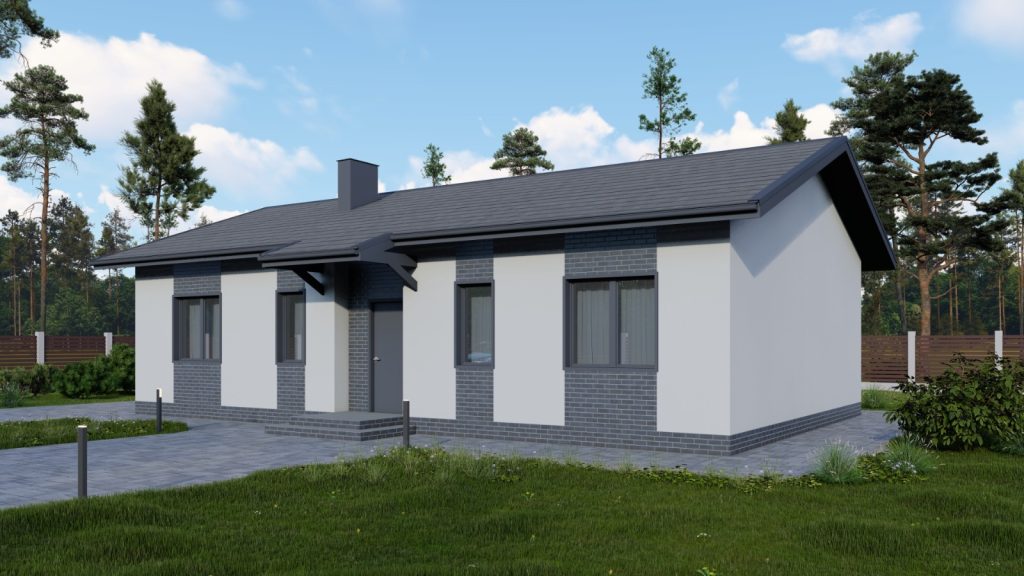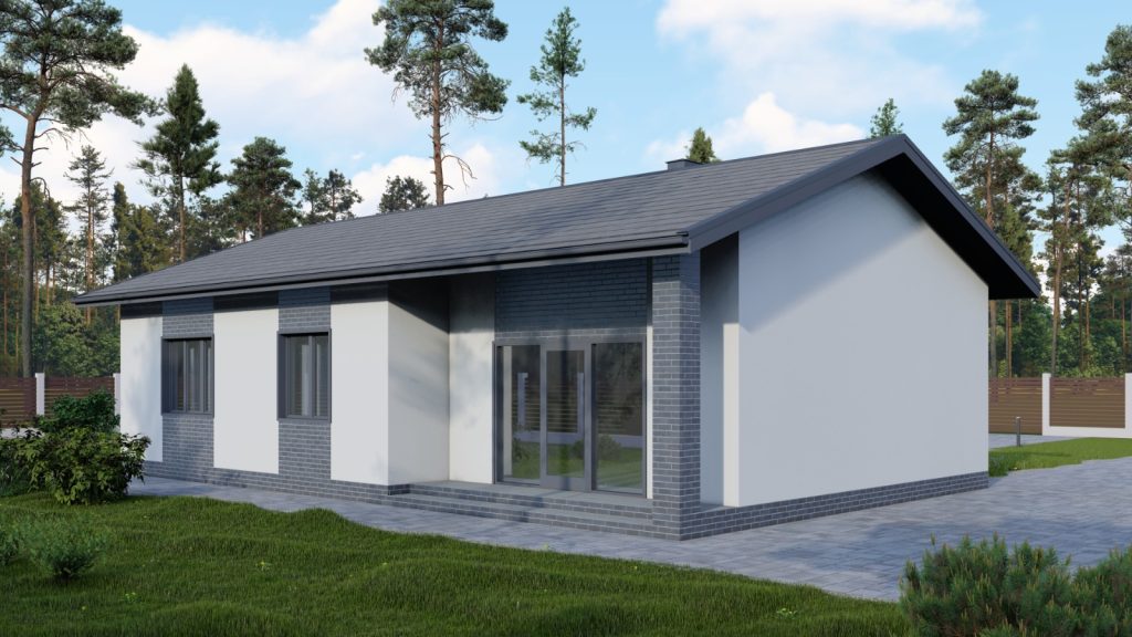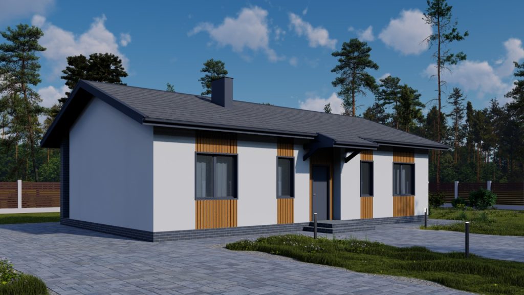 Одноэтажный дом с тремя спальнями, кухня-гостиная с выходом на террасу. Внутри дома есть отдельное изолированное помещение для инженерных систем.